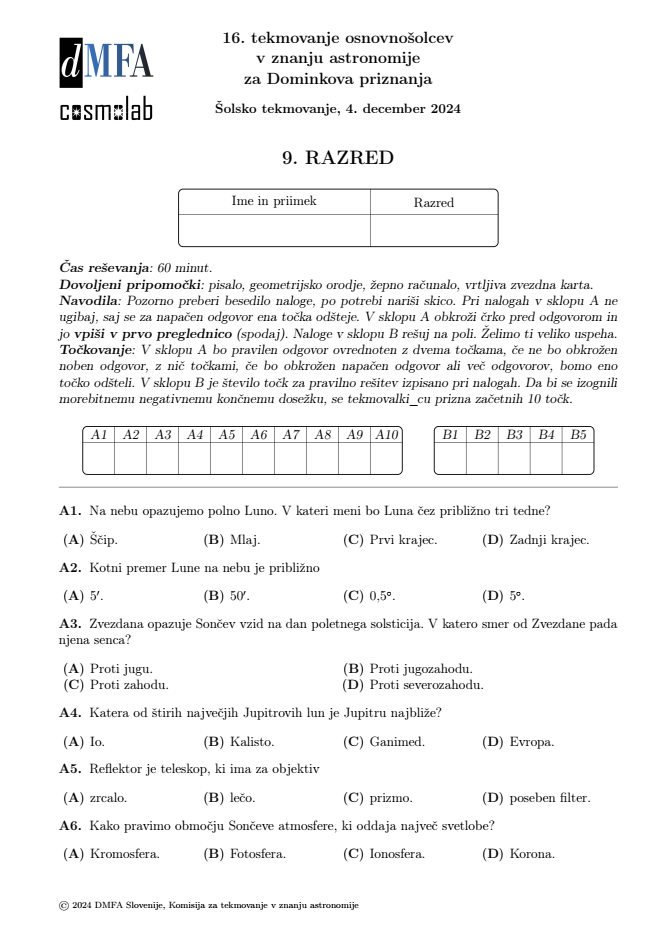 Za nami sta uspešno izvedeni šolski stopnji prvih dveh državnih tekmovanj v organizaciji DMFA Slovenije v šolskem letu 2025/26. Na šolskem tekmovanju iz razvedrilne matematike 9. decembra je sodelovalo 10.792 tekmovalk in tekmovalcev iz 300 osnovnih in srednjih šol, na šolskem tekmovanju iz astronomije 3. decembra pa 2160 tekmovalk in tekmovalcev iz 226 osnovnih in srednjih šol iz vse Slovenije. Najuspešnejše tekmovalke in tekmovalci bodo povabljeni na državno stopnjo tekmovanja. Državno tekmovanje iz astronomije bo potekalo v soboto, 10. januarja, gostile ga bodo Sr. šola Veno Pilon Ajdovščina, Gimnazija Bežigrad in Gimnazija Šentvid v Ljubljani, I. gimnazija v Celju in Gimnazija Murska Sobota. Državno tekmovanje iz razvedrilne matematike pa bo v soboto, 31. januarja, na OŠ Šmartno pri Slovenj Gradcu, OŠ Bršljin, OŠ Jožeta Moškriča, Ljubljana, Gimnazija Bežigrad, OŠ Muta in Gimnazija Jurija Vege, Idrija.